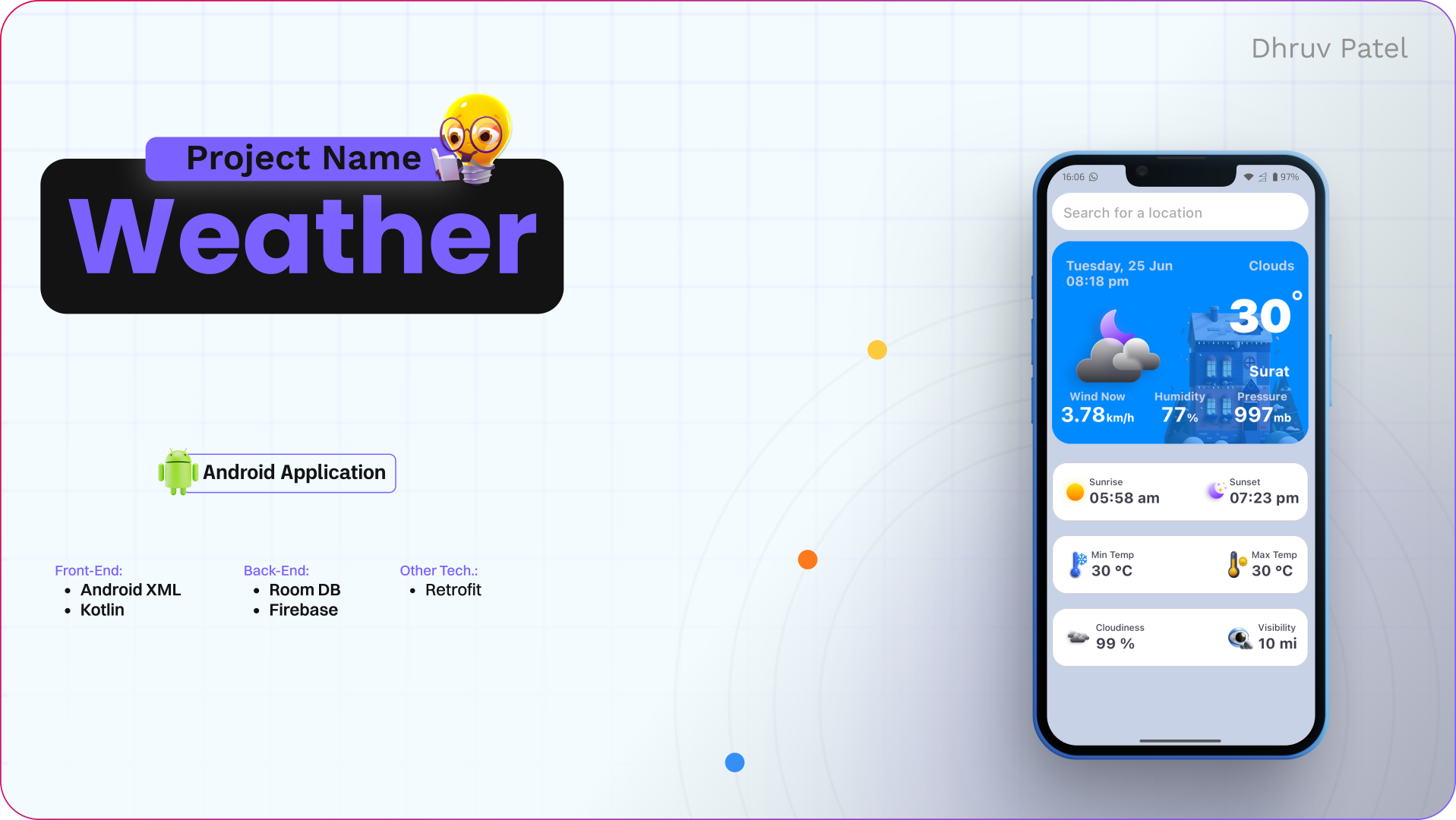 The weather app displays current weather data based on the city name. I utilized two APIs in the app: one to fetch current weather data based on the city name and another to provide city name suggestions during the search.